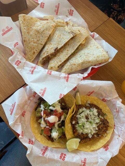 私たちは、ケサディーヤとチキン、フィッシュ、ビーフのタコスを注文しました。