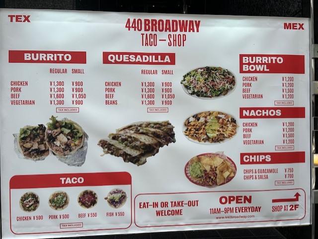 山手線恵比寿駅から徒歩10分ほどの場所にあるこちらのレストランは「440 Broadway Taco Shop」